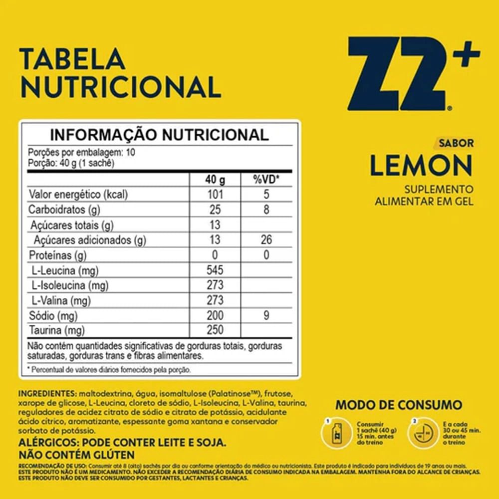 Consumir 1 sache (40g) 15 minutos antes do treino e/ou a cada 30-45 min durante o treino